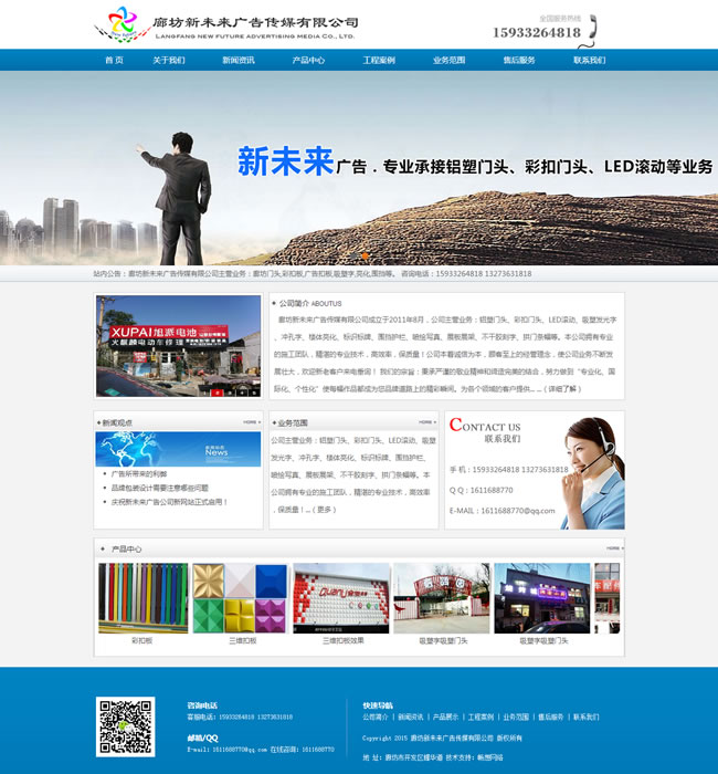 廊坊新未來(lái)廣告?zhèn)髅接邢薰境闪⒂?011年8月,公司主營(yíng)業(yè)務(wù):鋁塑門頭、彩扣門頭、LED滾動(dòng)、吸塑發(fā)光字、沖孔字、樓體亮化、標(biāo)識(shí)標(biāo)牌、圍擋護(hù)欄、噴繪寫真、展板展架、不干膠刻字、拱門條幅等。本公司擁有專業(yè)的施工團(tuán)隊(duì),精湛的專業(yè)技術(shù),高效率,保質(zhì)量!公司本著誠(chéng)信為本,顧客至上的經(jīng)營(yíng)理念,使公司業(yè)務(wù)不斷發(fā)展壯大。